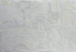 Le sujet figuré en peinture me donne un fil conducteur. Un départ. Un croquis. S’ensuivent ensuite les ajouts de matières, les empâtements, la recherche d’une forme de dé-figuration pour ne plus être sur l’objet même de la représentation, mais plutôt de son évocation, de son effacement. La couleur s’invite, le mouvement apparaît. Une première séance qu’il faudra reprendre. Chaque sujet fera l’objet d’un traitement particulier, différentes études monochromes et une plus conséquente, polychrome, résultante des recherches entreprises en amont.