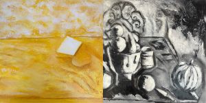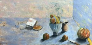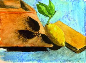 Citron, livre de contes et boîte à cigares, huile sur papier, 40 x 28 cm, 2025
